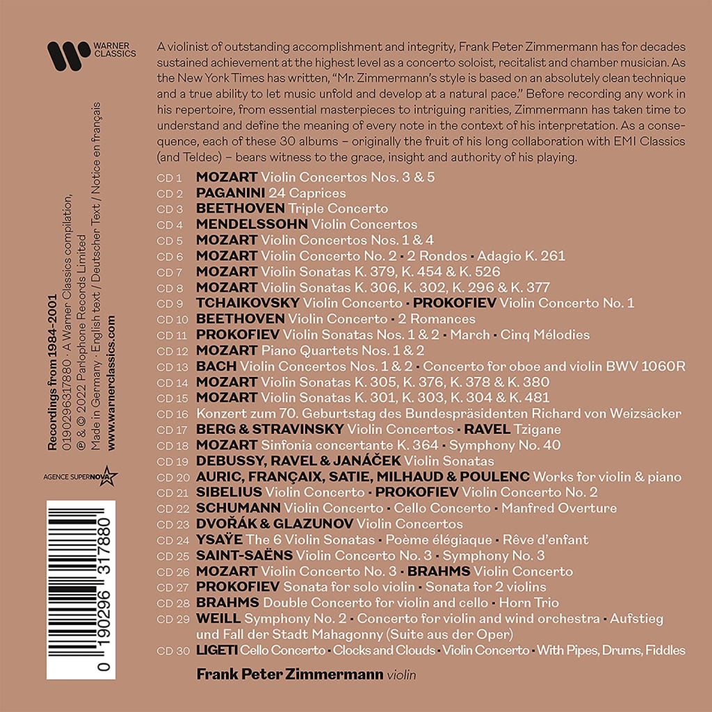 A violinist of outstanding accomplishment and integrity, Frank Peter Zimmermann has for decades sustained achievement at the highest level as a concerto soloist, recitalist and chamber musician. As the New York Times has written, "Mr. Zimmermann's style is based on an absolutely clean technique and a true ability to let music unfold and develop at a natural pace." Before recording any work in his repertoire, from essential masterpieces to intriguing rarities, Zimmermann has taken time to understand and define the meaning of every note in the context of his interpretation. As a consequence, each of these 30 albums - originally the fruit of his long collaboration with EMI Classics (and Teldec) - bears witness to the grace, insight and authority of his playing.