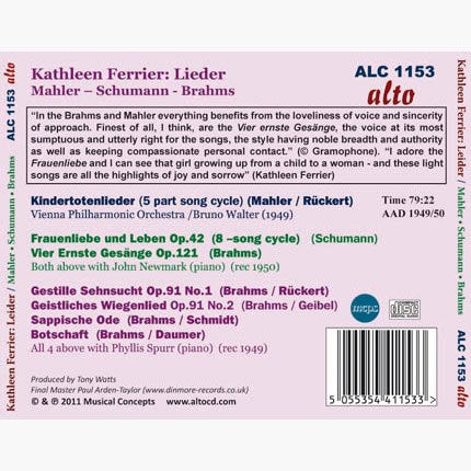 “In the Brahms and Mahler everything benefits from the loveliness of voice and sincerity of approach. Finest of all, I think, are the Vier ernste Gesänge, the voice at its most sumptuous and utterly right for the songs, the style having noble breadth and authority as well as keeping compassionate personal contact.” (© Gramophone).