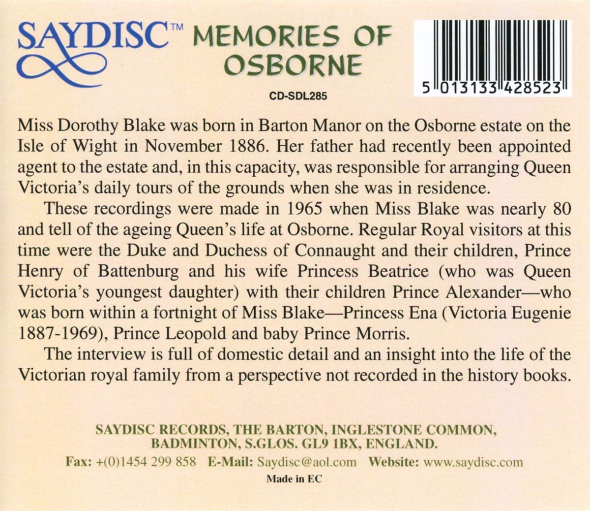Miss Dorothy Blake was born in Barton Manor on the Osborne estate on the Isle of Wight in November 1886. Her father had recently been appointed agent to the estate and, in this capacity, was responsible for arranging Queen Victoria’s daily tours of the grounds when she was in residence. These recordings were made in 1965 when Miss Blake was nearly 80 and tell of the ageing Queen’s life at Osborne. Regular Royal visitors at this time were the Duke and Duchess of Connaught and their children, Prince Henry of Battenburg and his wife Princess Beatrice (who was Queen Victoria's youngest daughter) with their children Prince Alexander — who was born within a fortnight of Miss Blake — Princess Ena (Victoria Eugenie 1887 - 1969), Prince Leopold and baby Prince Morris. The interview is full of domestic detail and an insight into the life of the Victorian royal family from a perspective not recorded in the history books.