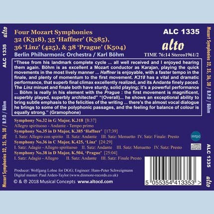 “These from his landmark complete cycle … all well received and I enjoyed hearing them again. Böhm is as excellent a Mozart conductor as Karajan, playing the quick movements in the most lively manner … Haffner is enjoyable, with a faster tempo in the finale, and plenty of momentum to the first movement. K318 has a vital and dramatic performance, The Linz minuet and finale both have sturdy, solid playing; a powerful performance … Böhm is really in his element with the Prague : the first movement is magnificent, superbly played, superbly architected” “(Overall)… he shows an exceptional ability to bring subtle emphasis to the felicities of the writing … (Gramophone)