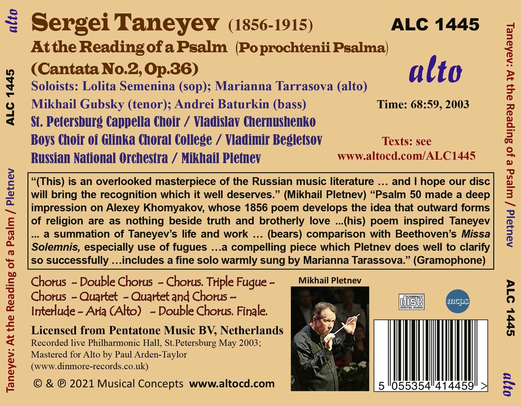 “Psalm 50 made a deep impression on Alexey Khomyakov, whose 1856 poem develops the idea that outward forms of religion are as nothing beside truth and brotherly love …(his) poem inspired Taneyev … a summation of Taneyev’s life and work … (bears) comparison with Beethoven’s Missa Solemnis, especially use of fugues …a compelling piece which Pletnev does well to clarify so successfully …includes a fine solo warmly sung by Marianna Tarassova.” (Gramophone)