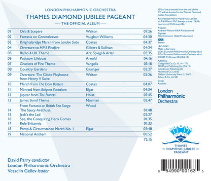 This album is released to mark the London Philharmonic Orchestra's participation in the flotilla on the afternoon of Sunday June 3rd as part of the Thames Diamond Jubilee Pageant. It includes music performed on board 'The Symphony' music herald barge as part of the 3 June flotilla. This CD offers a selection of popular works by great British (and Commonwealth) composers written during the time of our Queen's reign. 10% from each CD sale will be donated to the Thames Diamond Jubilee Foundation.