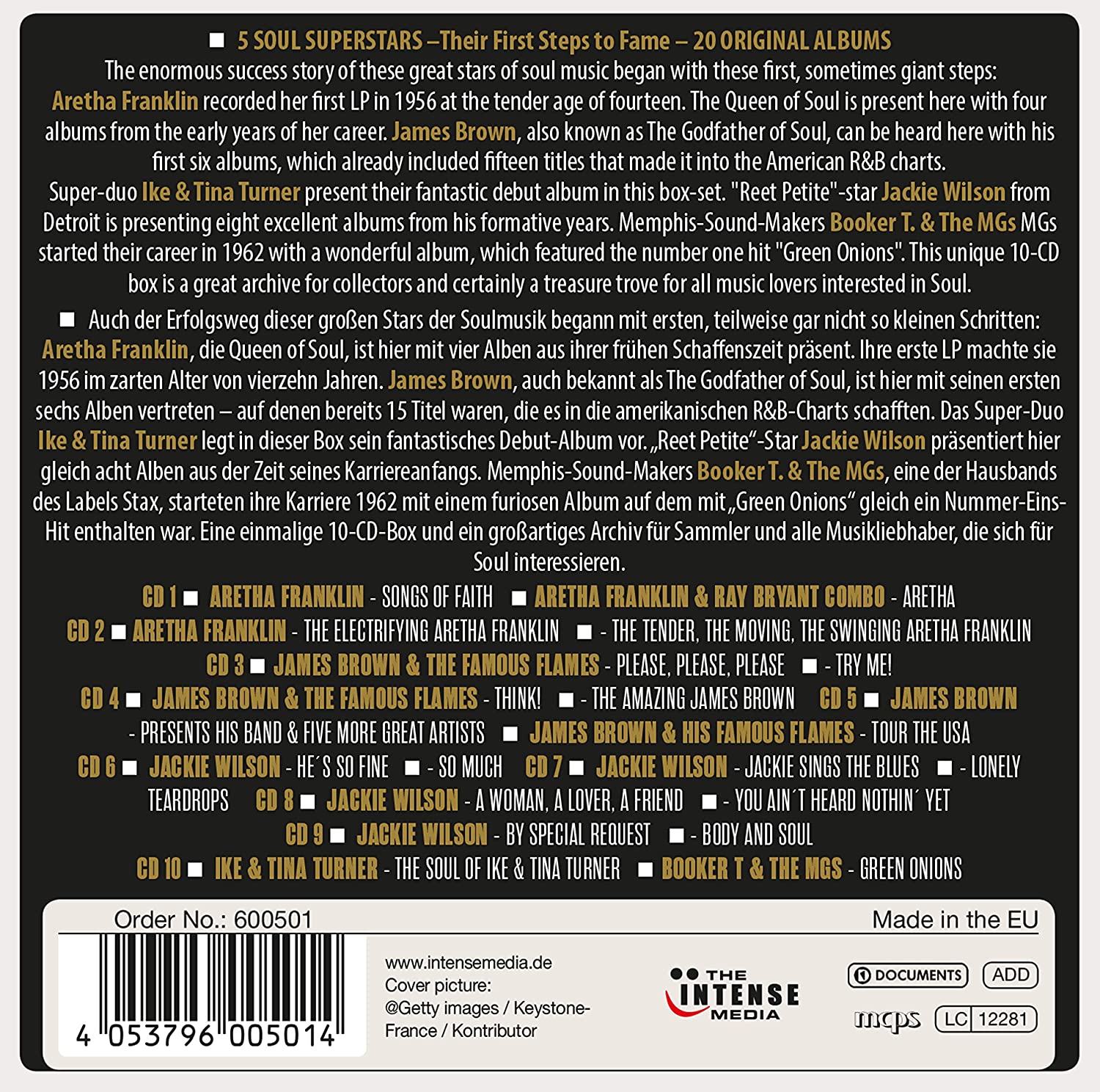 The enormous success story of these great stars of soul music began with these first, sometimes giant steps: Aretha Franklin, the Queen of Soul, is present here with four albums from the early years of her career. She recorded her first LP in 1956 at the tender age of fourteen. James Brown, also known as The Godfather of Soul, can be heard here with his first six albums, which already included fifteen titles that made it into the American R&B charts. Super-duo Ike & Tina Turner present their fantastic debut album in this box-set. "Reet Petite"-star Jackie Wilson from Detroit is presenting eight excellent albums from his formative years here. Memphis-Sound-Makers Booker T. & The MGs started their career in 1962 with a wonderful album, which featured the number one hit "Green Onions". This unique 10-CD box is a great archive for collectors and certainly a treasure trove for all music lovers interested in Soul.