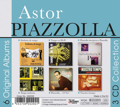 Six classic albums by the legendary Argentine tango composer, bandoneon player and arranger Astor Piazzolla on 3 CDs. The albums feature Piazzolla and his orchestras, alongside pianists Lalo Schiffrin and Martial Solal, guitarist Oscar López Ruiz and cellist José Bragato. The set includes the following albums released between 1955 and 1962: Sinfonia de Tango (1955), Tango moderno (1957), Sinfonia de Tango (1955), Tango moderno (1957), Piazzolla interpreta a Piazzolla (1961) and Nuestro tiempo (1962).