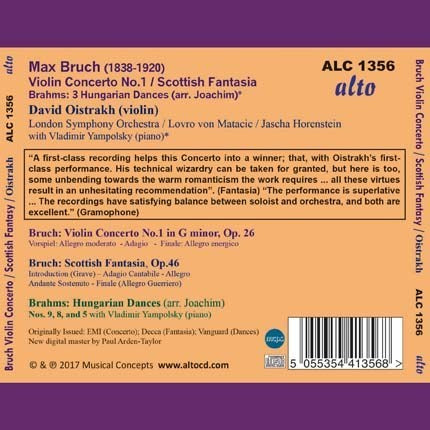 “A first-class recording helps this Concerto into a winner; that, with Oistrakh’s first-class performance. His technical wizardry can be taken for granted, but here is too, some unbending towards the warm romanticism the work requires … all these virtues result in an unhesitating recommendation”. (Fantasia) “The performance is superlative … The recordings have satisfying balance between soloist and orchestra, and both are excellent.”