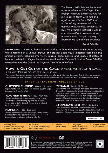 From 1982 to 1992 Frank Scheffer worked with John Cage on many different occasions, which resulted in a unique archive of historical audio-visual material. Based on this unique archive, including interviews, musical performances and images of different locations related to his life and work—filmed on 16mm—the filmmaker Scheffer created How to Get Out of the Cage—A Year with John Cage. Frank Scheffer wrote: "The famous artist Marina Abramovic introduced me to John Cage. She thought it would be worthwhile for me to get in touch with him and right she was! In June 1982 I did an hour-long interview with him without knowing how influential he was. He loved the fact that it was an interview without preconceptions. It dramatically changed my way of thinking. He had opened my mind!" Includes 5 experimental films.