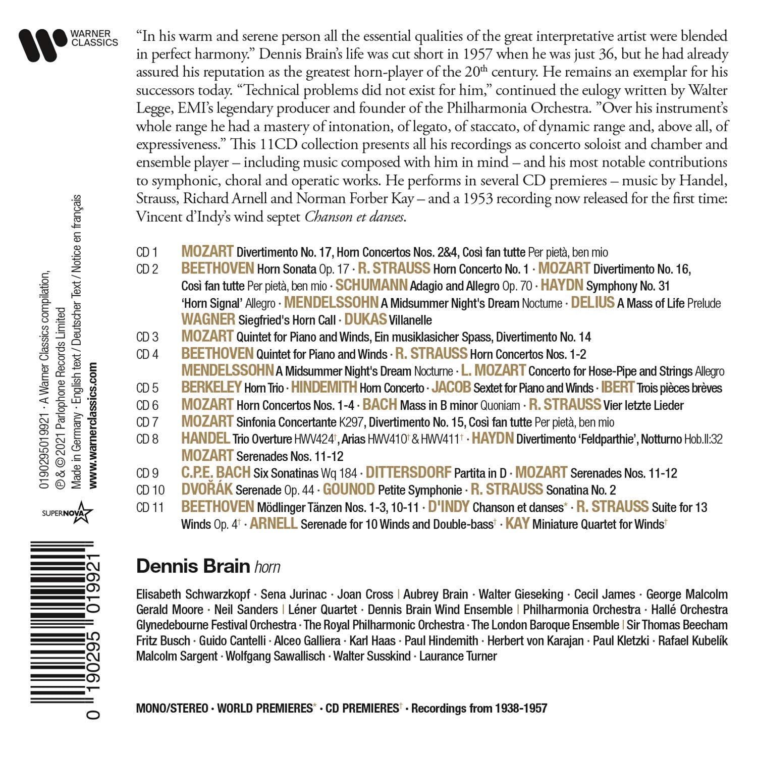 This 11CD collection presents all his Warner recordings as concerto soloist and chamber and ensemble player – including music composed with him in mind – and his most notable contributions to symphonic, choral and operatic works. He performs in several CD premieres – music by Handel, Strauss, Richard Arnell and Norman Forber Kay – and a 1953 recording now released for the first time: Vincent d’Indy’s wind septet Chanson et danses.