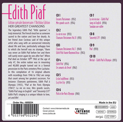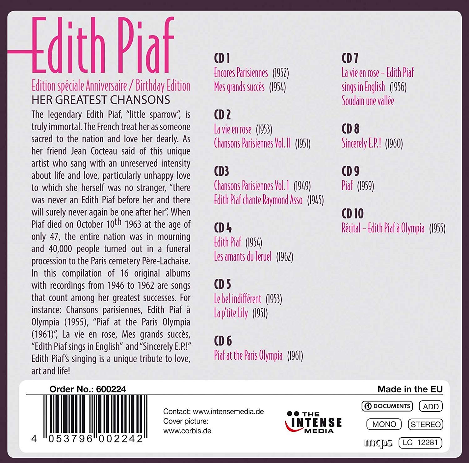 The legendary Edith Piaf, ''little sparrow'', is truly immortal. The French treat her as someone sacred to the nation and love her dearly. As her friend Jean Cocteau said of this unique artist who sang with an unreserved intensity about life and love, particularly unhappy love to which she herself was no stranger, ''there was never an Edith Piaf before her and there will surely never again be one after her''. When Piaf died on October 10th 1963 at the age of only 47, the entire nation was in mourning and 40,000 people turned out in a funeral procession to the Paris cemetery Père- Lachaise. In this compilation of 16 original albums with recordings from 1946 to 1962 are songs that count among her greatest successes. For instance: Chansons parisiennes, Edith Piaf à Olympia (1955), ''Piaf at the Paris Olympia (1961)'', La vie en rose, Mes grands succès, ''Edith Piaf sings in English'' and ''Sincerely E.P.!'' Edith Piaf s singing is a unique tribute to love, art and life!