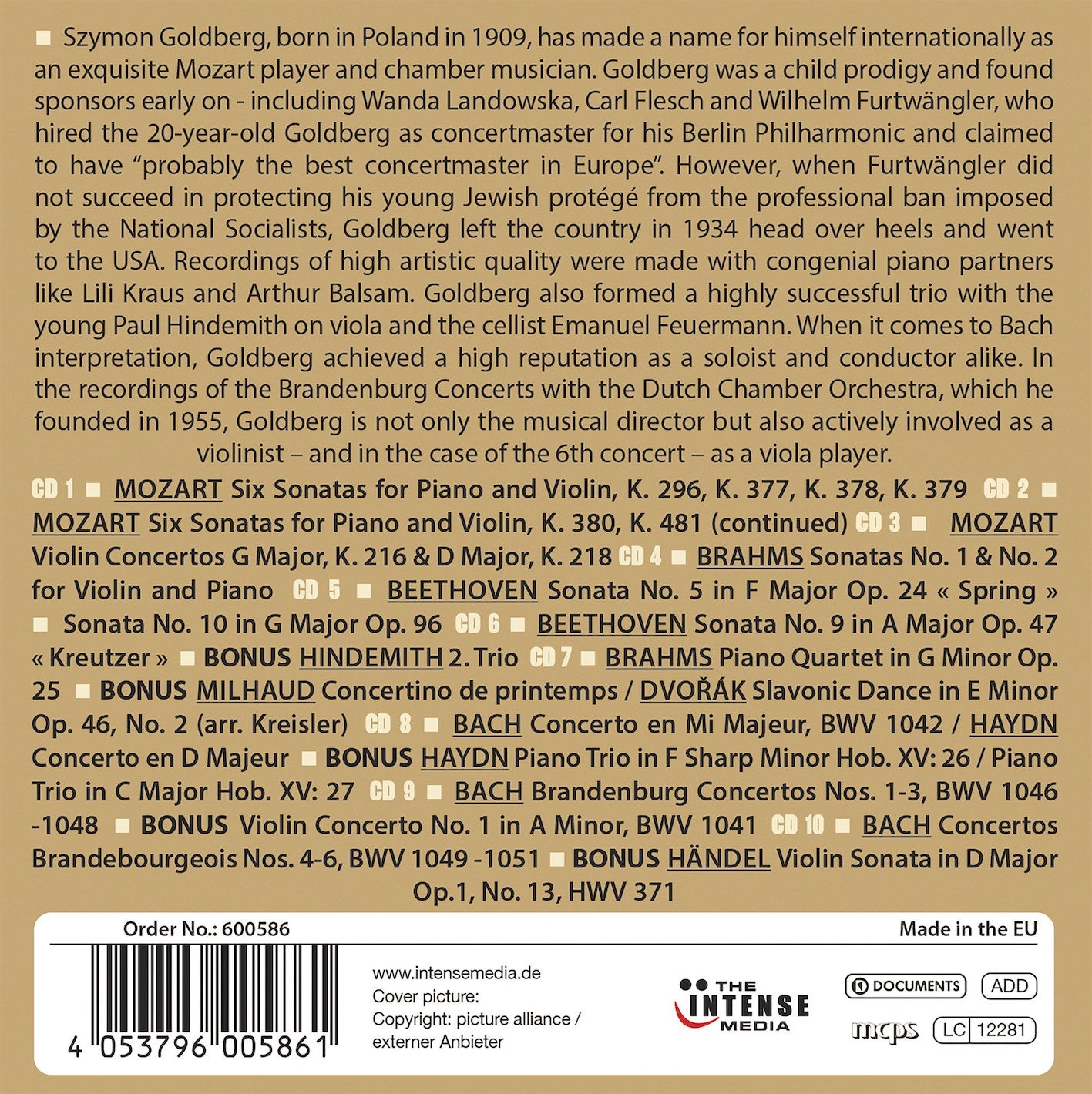 Recordings of high artistic quality were made in cooperation with congenial piano partners like Lili Kraus and Arthur Balsam. Goldberg also formed a top-class and highly successful trio with the young Paul Hindemith on viola and the cellist Emanuel Feuermann. When it comes to Bach interpretation, Goldberg achieved a high reputation as a soloist and conductor alike. In the recordings of the Brandenburg Concerts with the Dutch Chamber Orchestra, which he founded in 1955, Goldberg is not only the musical director but also actively involved as a violinist – and in the case of the 6th concerto, as a viola player.