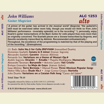 A prince of the guitar has arrived in the musical world’ (Segovia) “the guitarist’s skill must be exercised rather more fully, though you would not think so from John Williams’ performance – invariably splendid; so is the recording” “I, personally, enjoy Duarte’s guitar transcriptions of the Bach Suites for cello played thus even more than as originally conceived. The Scarlatti pieces are a Sonata transcribed by Segovia, and Gavotte excellently transcribed by Ablóniz. Recommended enthusiastically!