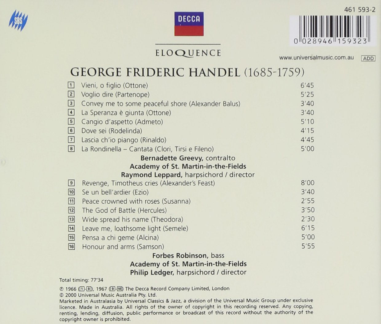 HANDEL: Great Arias - Greevy, Robinson, Academy of St. Martin in the Fields, Leppard