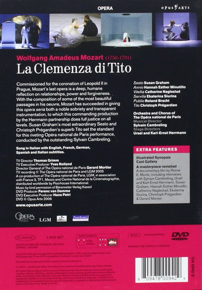 Commissioned for the coronation of Leopold II in Prague, Mozart's last opera is a deep, humane reflection on relationships, power and forgiveness. With the composition of some of the most beautiful passages in his oeuvre, Mozart has succeeded in giving this operaseria both a noble sobriety and transparent instrumentation, to which this commanding production by the Hermann partnership does full justice on all levels. Susan Graham's most extraordinary Sesto and Christoph Prégardien's superb Tito set the standard for this riveting Opéra National de Paris performance, conducted by the outstanding Sylvain Cambreling.
