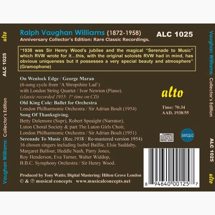 “1938 was Sir Henry Wood’s jubilee and the magical Serenade to Music which Ralph Vaughan Williams wrote for it… this, with the original soloists RVW had in mind, has obvious uniqueness but it possesses a very special beauty and atmosphere.” — Gramophone