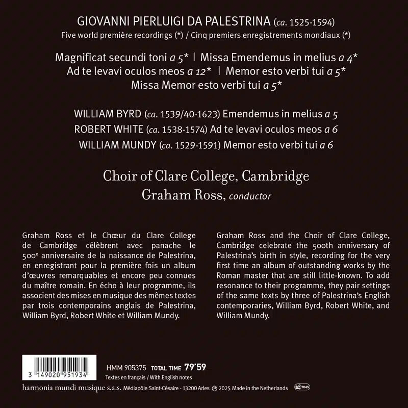 Graham Ross and the Choir of Clare College, Cambridge celebrate the 500th anniversary of Palestrina's birth in style, recording for the very first time an album of outstanding works by the Roman master that are still little-known. To add resonance to their program, they pair settings of the same texts by three of Palestrina's English contemporaries: William Byrd, Robert White, and William Mundy.