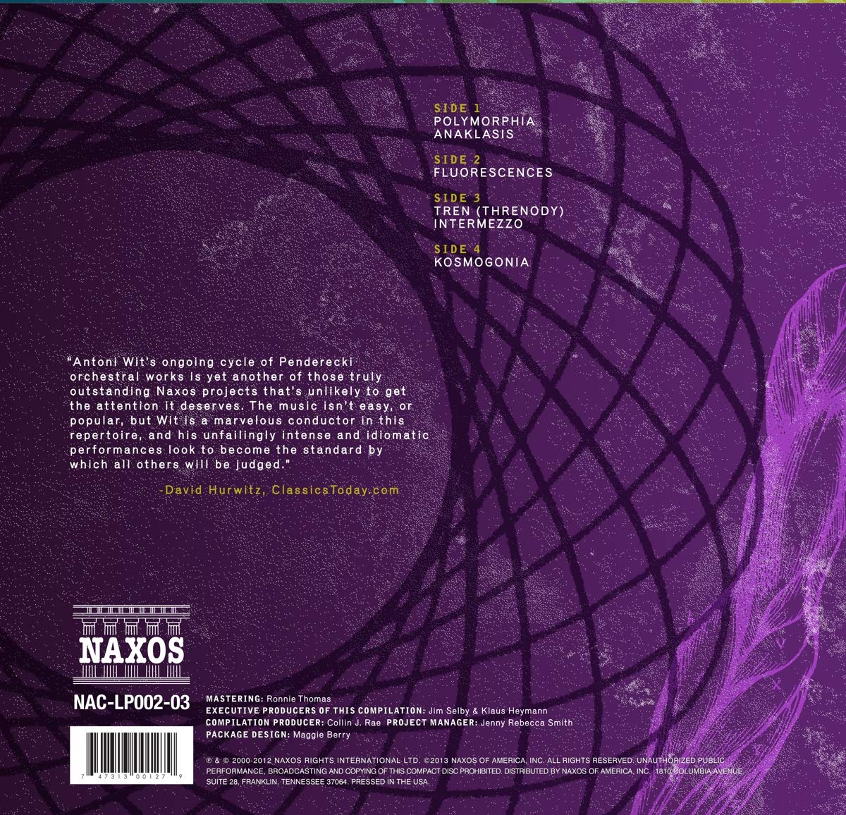 Antoni Wit's ongoing cycle of Penderecki orchestral works is yet another of those truly outstanding Naxos projects that's unlikely to get the attention it deserves. The music isn't easy, or popular, but Wit is a marvelous conductor in this repertoire, and his unfailingly intense and idiomatic performances look to become the standard by which all others will be judged.' -David Hurwitz, ClassicsToday.com