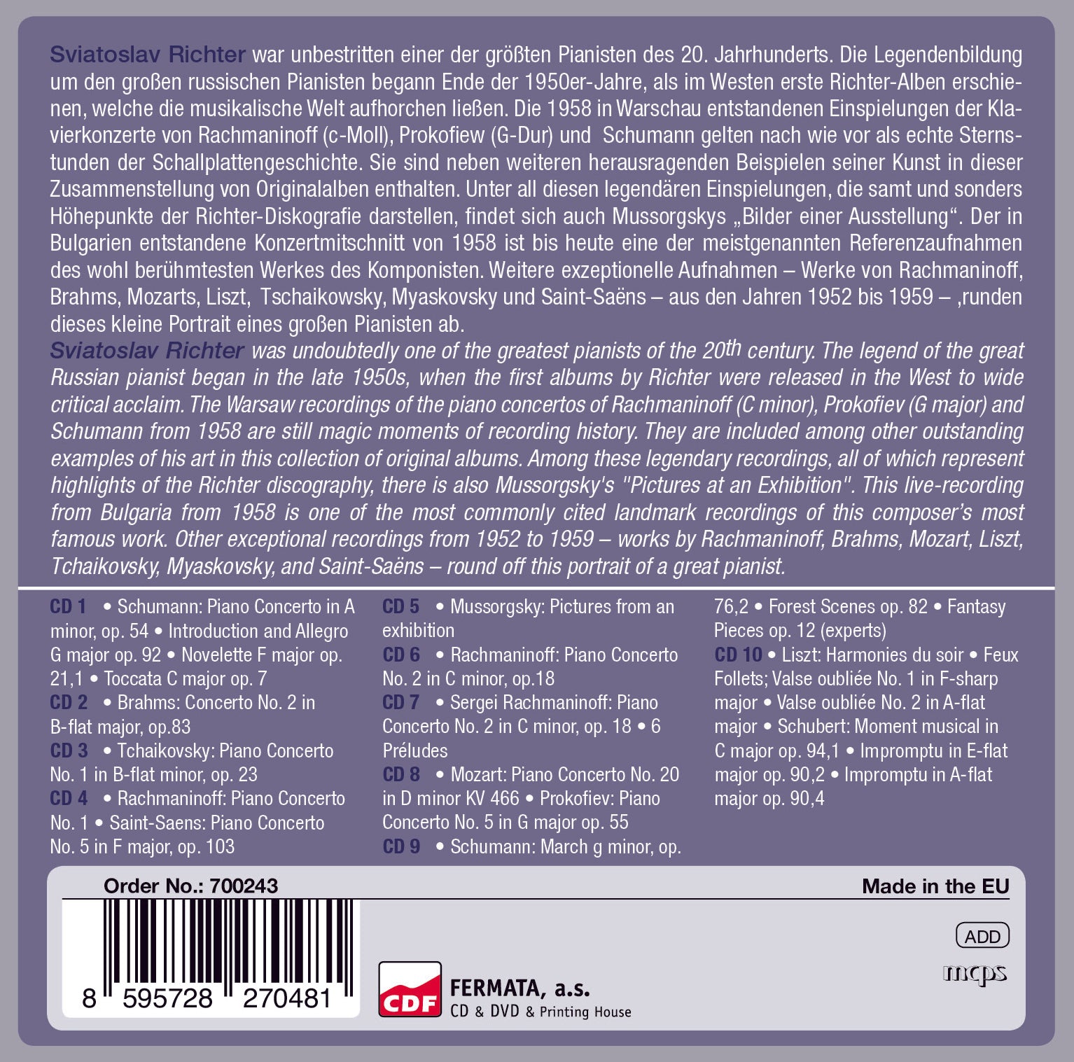 Sviatoslav Richter was unquestionably one of the greatest pianists of the 20th century and this outstanding collection of 10 original albums (with the original sleeves included in a specially-priced box) demonstrates perfectly his art. It is released to mark the 100th anniversary of his birth. The legend surrounding the great Russian pianist began at the end of the 1950s, when the first Richter albums appeared in the West and the musical world began to take notice. The recordings of piano concertos by Rachmaninov (in C minor), Prokofiev (in G major) and Schumann that were made in 1958 are still regarded as true highlights of recording history. All are included here alongside such legendary recordings from the Richter discography as Mussorgsky's 'Pictures at an Exhibition'. This 1958 recording of a live performance in Bulgaria is one of the most quoted benchmark versions of what is probably the composer's most famous work. From the series of recordings made in Russia those of the first two Rachmaninov concertos under Kurt Sanderling (1955 and 1959) are particularly noteworthy. Rachmaninov's works have a special place in Richter's repertoire, and the 6 preludes that can be heard here in a much acclaimed recording made in 1959 numbered among his personal favourites. As Richter played chiefly pieces from the romantic repertoire his well-known recording of Brahms' Piano Concerto No. 2 under Leinsdorf is by no means out of place. Other exceptional recordings of works by Mozart, Liszt, Tchaikovsky, Myaskovsky and Saint-Sans made between 1952 and 1959 round off this portrait of a truly great pianist.