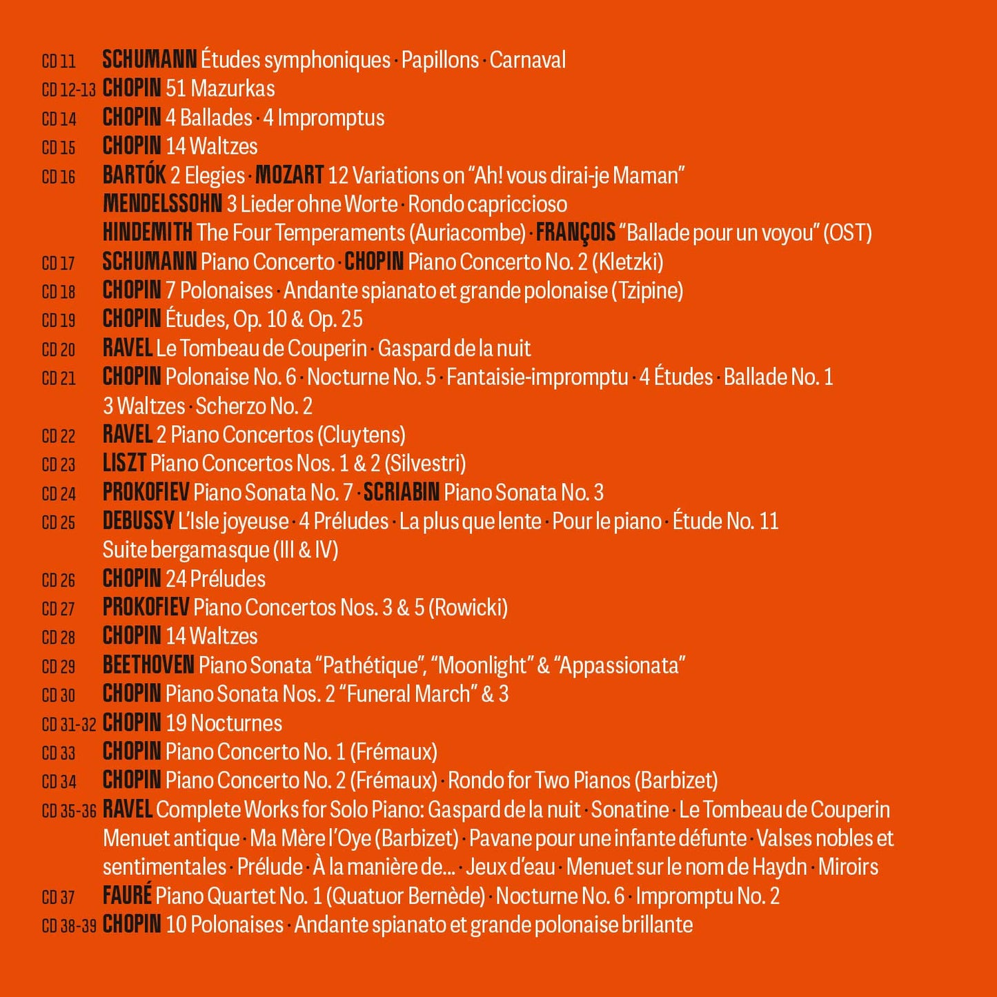 Samson François: The Complete Recordings: The works of Chopin are especially prominent in the collection – the melodic contours of any music were the determining factor for François – but the complete list of composers is richly diverse: Bach, Bartók, Beethoven, Debussy, Fauré, Franck, Hindemith, Liszt, Mendelssohn, Mozart, Prokofiev, Ravel (including the famous recording of the two piano concertos, conducted by André Cluytens), Saint-Saëns, Schumann and Scriabin. There is also music by François himself, including a film soundtrack.