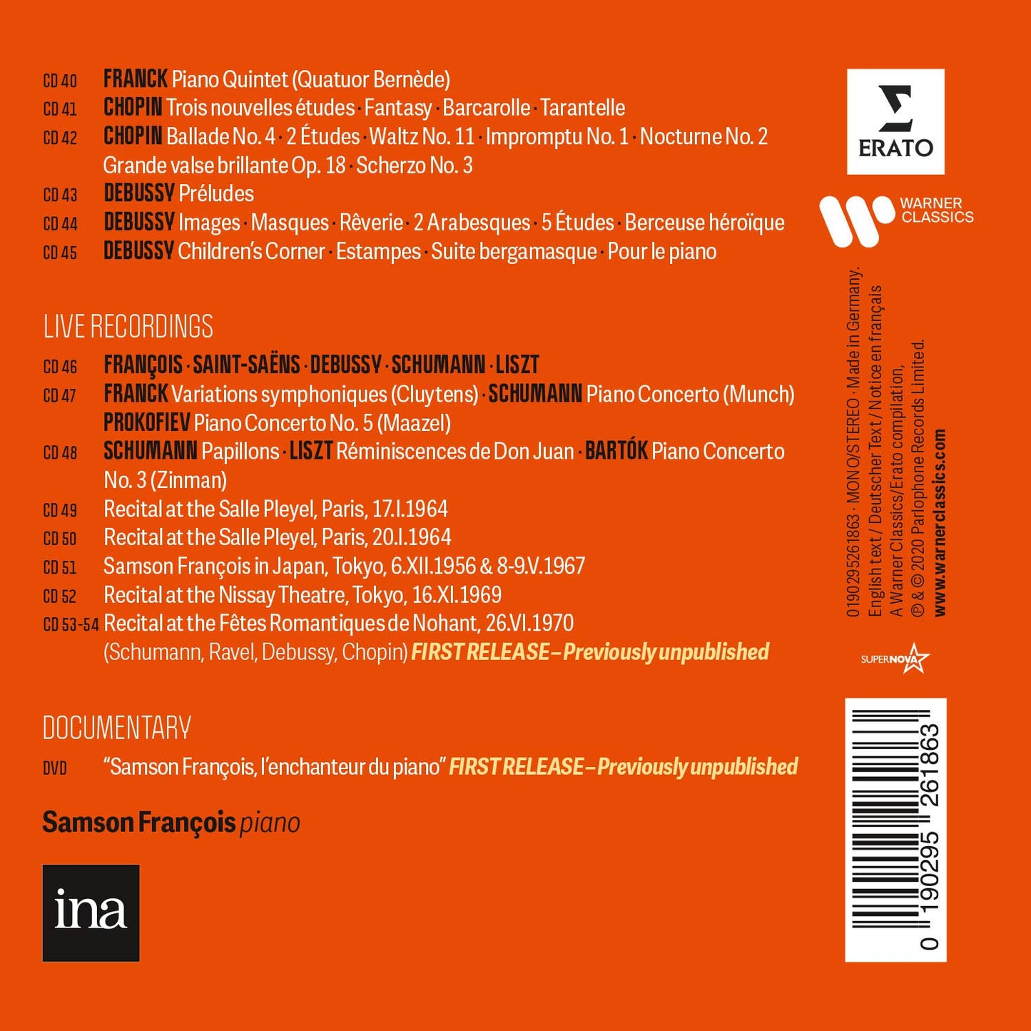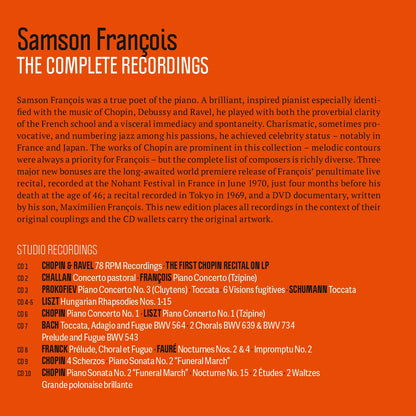 Three major new bonuses are the long-awaited world premiere release of François' penultimate live recital, recorded at the Nohant Festival in France in June 1970, just four months before his death at the age of 46; a recital recorded in Tokyo in 1969, and a DVD documentary, written by his son, Maximilien François. This new edition places all recordings in the context of their original couplings and the CD wallets carry the original artwork.