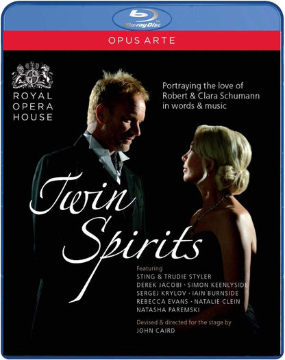 Twin Spirits is a unique and intimate, live theatrical performance by a chamber ensemble of actors, singers and musicians, portraying the deep and ultimately tragic love between the composer Robert Schumann and his pianist wife Clara Wieck. In this intensely moving performance of words, song and music, the Schumanns' long separation, so formative an influence on their lives, is reflected in the division of the ensemble into male and female groups. Robert's letters to Clara are read by Sting and his songs sung by Simon Keenlyside, with accompaniments and instrumental music played by Iain Burnside and Sergej Krylov. Clara's letters to Robert are read by Trudie Styler and her songs sung by Rebecca Evans, with accompaniments and instrumental music played by Natalie Clein and Natasha Paremski. The narrator, Derek Jacobi, links together the letters and lyrics to complete the essential outline of the story. Conceived and directed by John Caird, Twin Spirits was first performed in June 2005 at the Royal Opera House, Covent Garden, London and has since been experienced only at private performances for charity by small audiences of all ages and interests, leaving them deeply touched and inspired.
