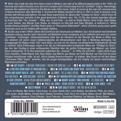 When Jazz made the big step from dance music to Modern Jazz with all its di erent playing styles in the 1940s, its harmony and rhythm became more and more complex and it moved away from his "primitive" origins. Interestingly, however, this sparked an interest in the African roots of the music, fueled of course by the new self-consciousness of African Americans after World War II. The drummer Art Blakey traveled to Africa in 1947 in order to become more familiar with African polyrhythms. He used all of these experiences for albums like "Holidays for Skins", which kicks o this comprehensive overview of the great drummers of Modern Jazz.