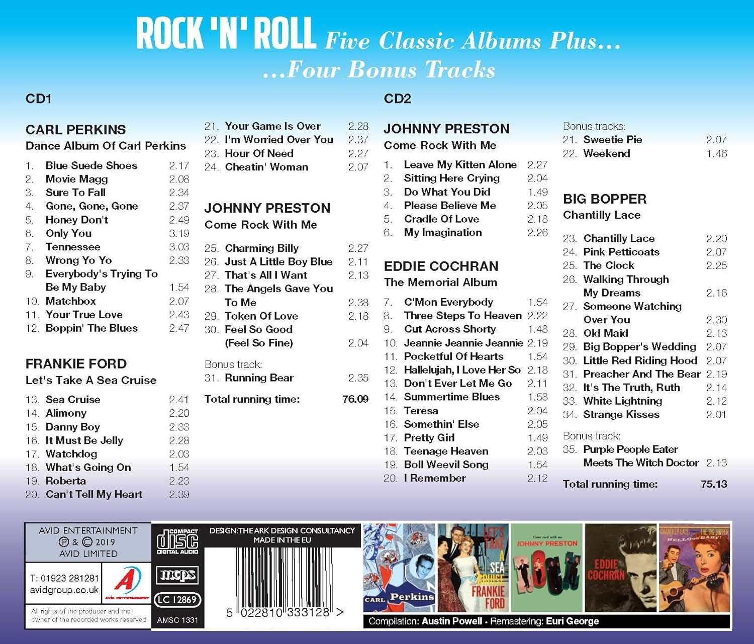 AVID Rock N Roll continues with its Five Classic Albums series with a re-mastered 2CD release starring Carl Perkins, Eddie Cochran, Johnny Preston, The Big Bopper & Frankie Ford, complete with original artwork, liner notes and personnel details.