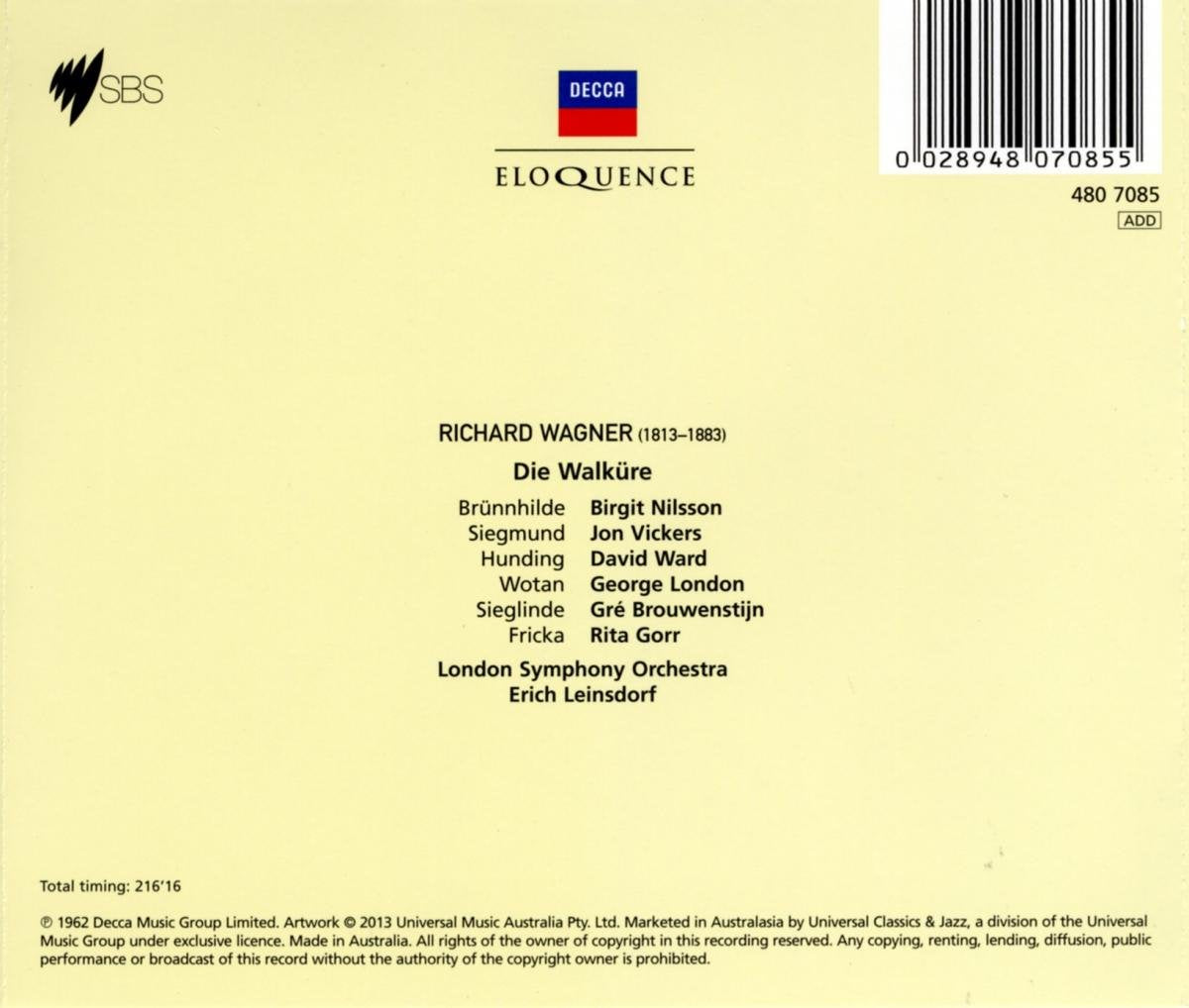 Possibly the most thrilling, sexually-charged ‘Walküre’ ever recorded, this CD features the sappy voices of Gré Brouwenstijn and Jon Vickers as Sieglinde and Siegmund coupled with two of the leading Wagnerians of their day – Nilsson and London – as Brünnhilde and Wotan. Also listen out for the wind machine introduced in the Prelude to Act I! This is real aural theatre.