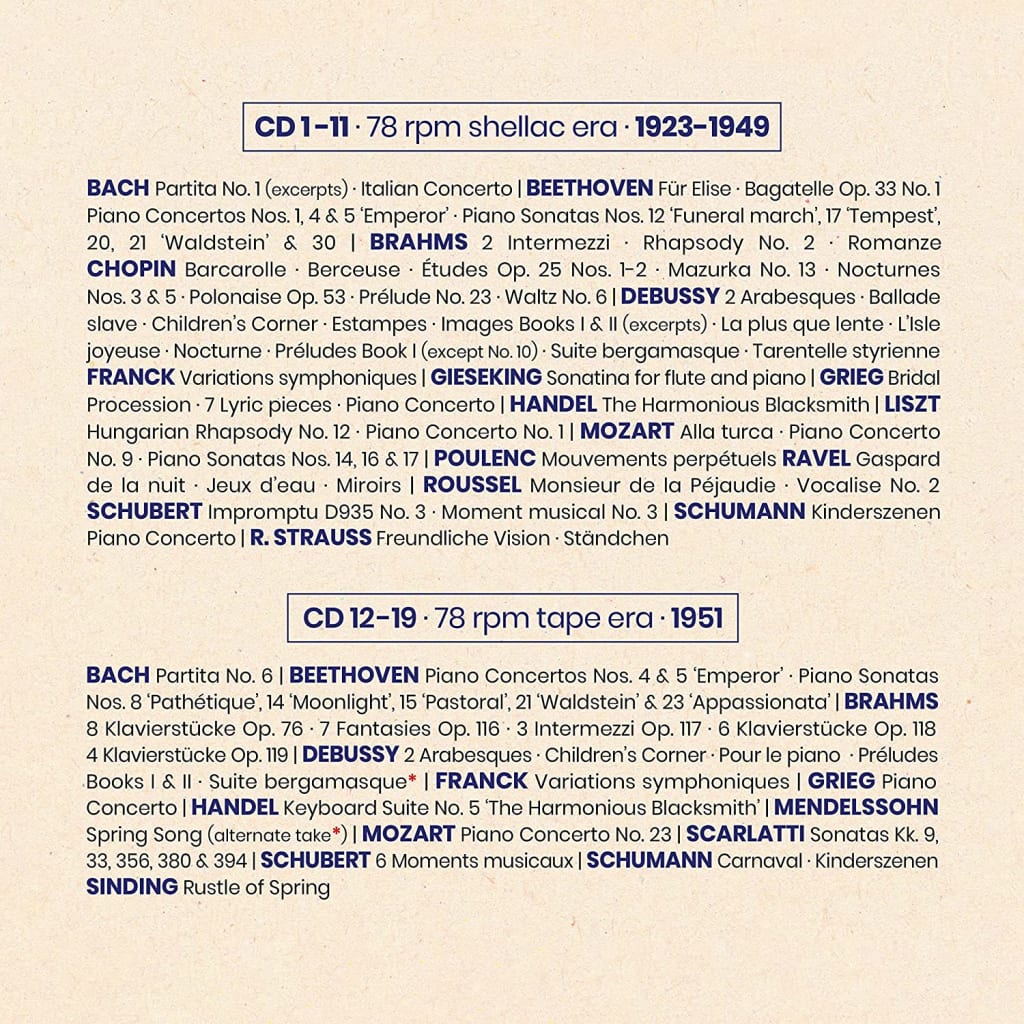 This 48-CD set unites all the recordings that the pianist Walter Gieseking (1895-1956) recorded between 1923 and 1956 for the following labels: Columbia Graphophone (78s and LP) and Homocord (78s). The collection includes nine world-premiere releases and a substantial number of CD premieres and rarities.