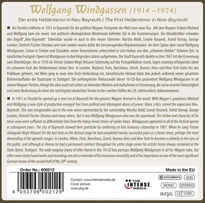 The wide-ranging choice of titles found in this 10-CD set portray the great German heroic tenor Wolfgang Windgassen in all his Wagner roles. Also featured are rarely heard works and recordings which reveal his enormous versatility and importance as one of the most significant German voices of the 20 century.